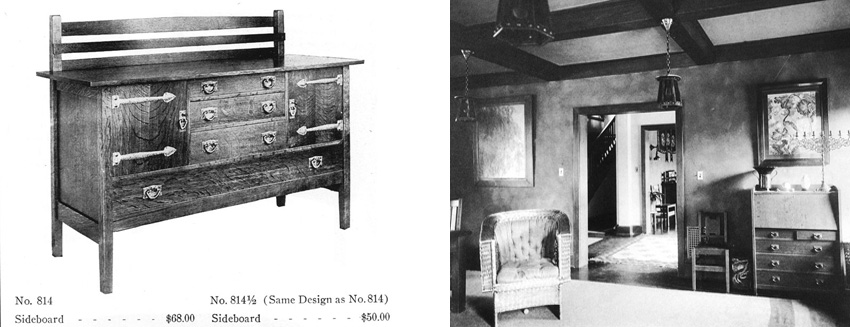 The list of objects used to support the authors’ subjective thesis, which is that Rohlfs was radically different from and superior to his contemporaries and that he was globally influential, is limited and biased toward the ADA1900 collection. A broader, more objective view would present more useful, accurate information even if it wouldn’t inflate the value of his furnishings as much. The Rohlfs table on the left had a green stain originally. It has many more similarities to the likely later L. & J. G. Stickley table on the right than the Rohlfs bench and Gustav Stickley settle discussed above have between them, but it cannot be said that one influenced the other. The point here is to show how Rohlfs can be fit into the Mission mainstream.