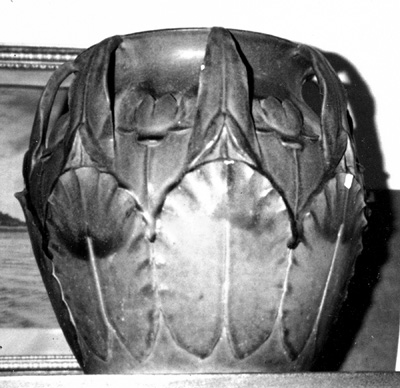 This large and rare Teco jardinière has various chips and flakes along the raised leaves. To my mind, restoration does not affect the value to a museum that wants to exhibit its aesthetic qualities, but I am in the minority among those who are qualified to vet such objects.