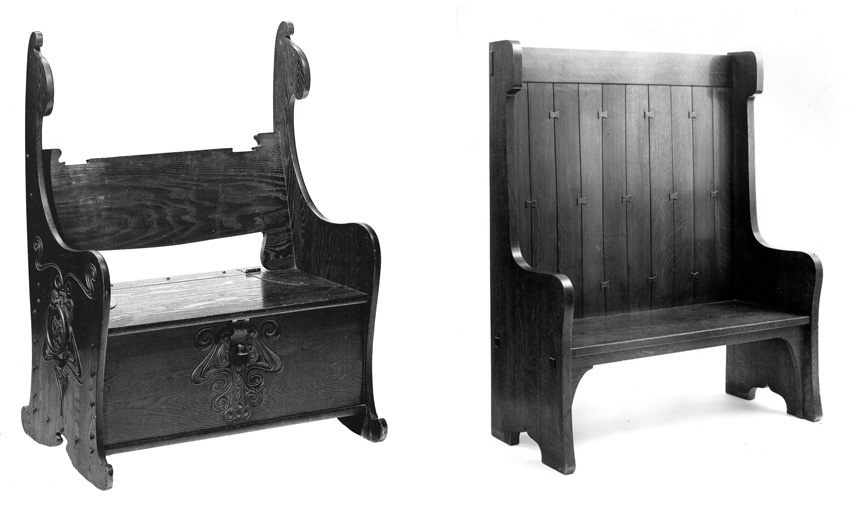 Dr. Cunningham writes, The bench’s [left] overall design and construction likely influenced the designer’s contemporary Gustav Stickley in nearby Syracuse. Buffalo is nearer to Syracuse than Olde England or New England, but Stickley’s settle design descends directly from contemporary British designs and Early American models. The solid, high back (missing in the Rohlfs bench) was essential functionally as such settles were set beside fireplaces to form inglenooks where warm air could be concentrated. Dr. Cunningham asserts that the Stickley settle is not finished on the back the way the Rohlfs bench is, which, to him, means that it had to be placed so the back was not visible, yet Stickley himself noted the potential for his settles to be used as room dividers. Since other versions of Stickley’s settle do not have the same lithe shaped ends, one would have to know which Stickley settle was designed first to establish even a slightly plausible comparison to the Rohlfs bench. But I quibble—they are both made of oak and they both have remarkably similar horizontal boards likely meant to be sat upon.