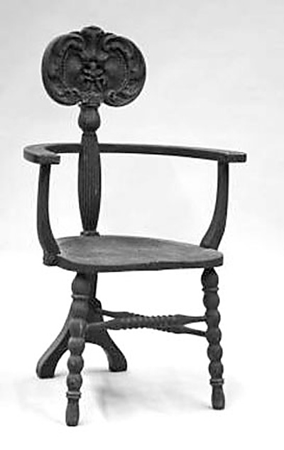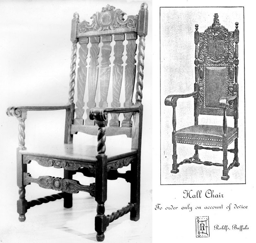 No actual copies of historic styles are included in the Rohlfs catalogue perhaps because his reproductions are so badly designed, but he did make such furniture. Will Price interpreted the Jacobean style (left) with far more success for his Rose Valley furniture factory. It could be that the first chair Rohlfs carved exists but is not now recognized because it does not relate to his developed style. . . There is less to be learned from those who seek to promote their own dictums by denouncing all others with needlessly pejorative words like appropriated and non-words like overinclusive. The doctors criticized the Wadsworth exhibit: