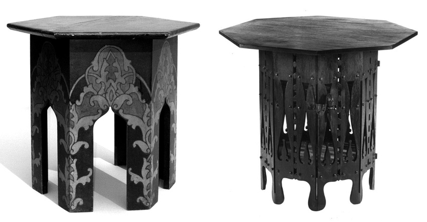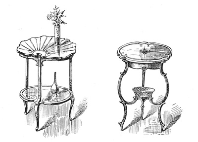 Tripod tables from a copy of Select Furniture in All Styles, Timms and Webb, The Furniture Press, London, 1890 that was owned by a New York furniture designer whose pencil drawings in the margins show simplifed “mission” designs based on these elaborate Edwardian confections. That particular designer did not live and work near Buffalo or Syracuse. |