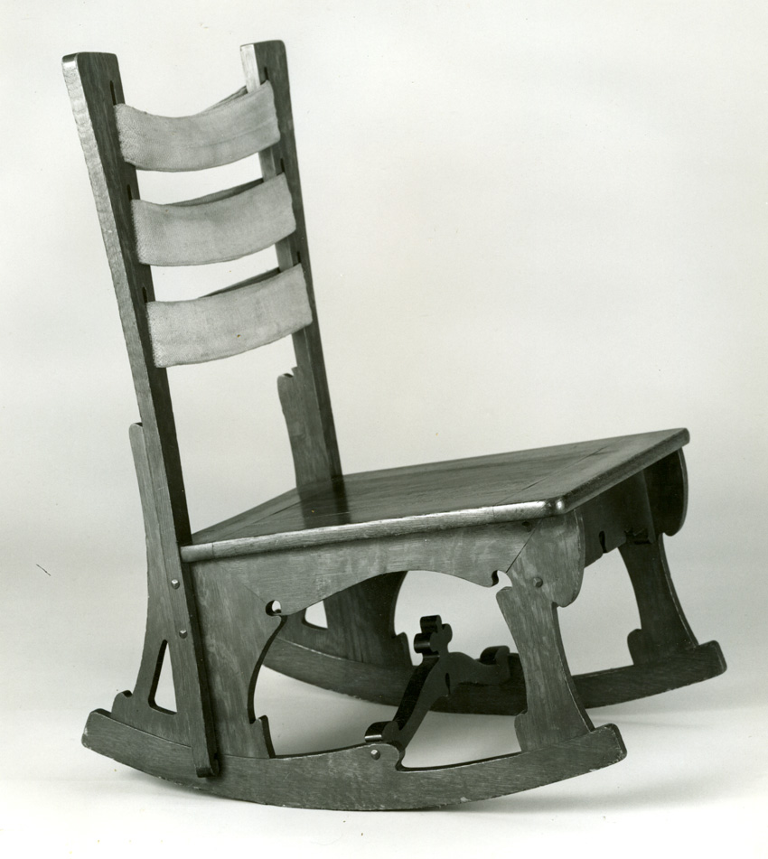 A spare and elegant set of similarly restrained cross-stretchers [not inconsequentially, box stretchers in this instance] form [sic] a boxlike apron supporting the structure of the Crib and giving a skirted sensibility to its midsection. This boxed cross-stretcher is a formation that A. Page Brown and Bernard Maybeck were to use, the very next year, near the foot of their celebrated “Mission Chair” designed for the Swedenborgian Church, San Francisco, 1893. The severe minimalism of the Crib is mitigated only by the inspired use of decorative screw heads, gracefully placed in vertical pairs immediately near the corner joints of each post. This merging of joinery calls to [Cunningham’s] mind the shaped wooden plugs Rohlfs used extensively on later furniture and anticipates the decorative ebony pegs featured fifteen years later in the furniture of Charles Sumner Greene and Henry Mather Green [sic].