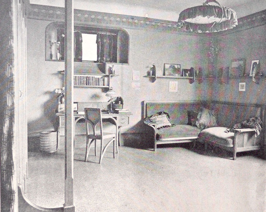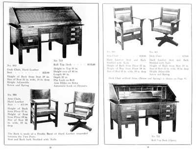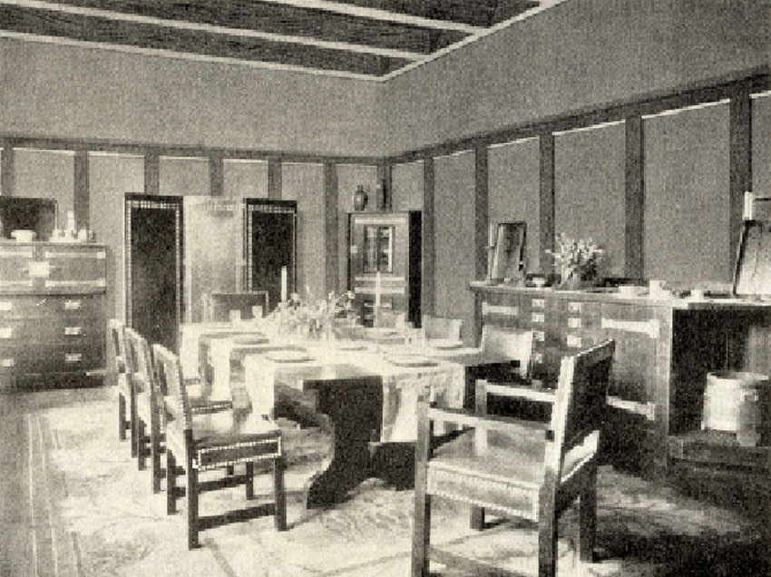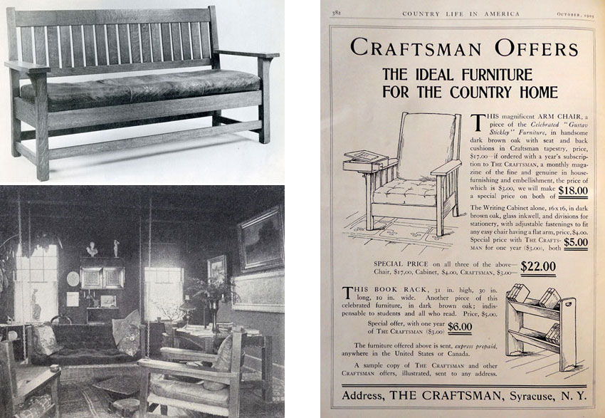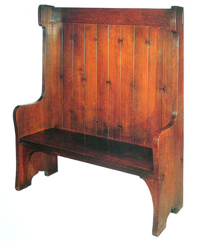| Tucker clearly states his intentions: “Gustav Stickley and the American Arts & Crafts Movement does not purport to revisit the entire spectrum of Stickley’s life and career, aspects of which have been capably discussed elsewhere, but instead focuses on the commercial and social context of his entry into the production of Arts and Crafts works, their relationship to the ideology of the movement and to the development of the Craftsman home and lifestyle, and the vibrant identity that was formed as a result of their creation and promotion.” Whew! That’s a tall order, which when broken down into comprehensible parts, is somewhat at odds with itself: The catalogue’s focus is in fact “the entire spectrum of Stickley’s life and career” that Tucker “does not purport to revisit” and the book and exhibit are striking for their lack of “commercial and social context.” This is excusable if one keeps in mind that the exhibition is an art museum (beauty) production and not the result of a material culture (lifestyle) study. Had he really focused on Stickley’s entry into Arts and Crafts-style production and its relation to the American lifestyle, he would have included the office desks, swivel chairs and safes that are interesting because they had the potential to extend the Arts and Crafts ideal beyond the home and into the workplace. However, even if one stays home, there is no piano (perhaps because of logistics) and neither of the high-backed settles Stickley used in his Syracuse home and featured in early issues of The Craftsman.