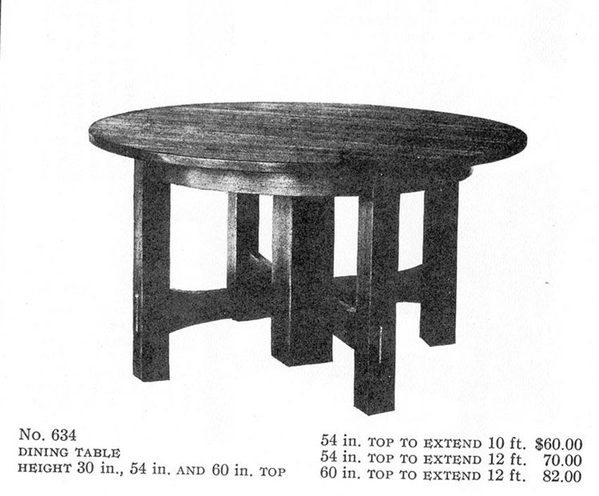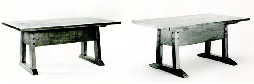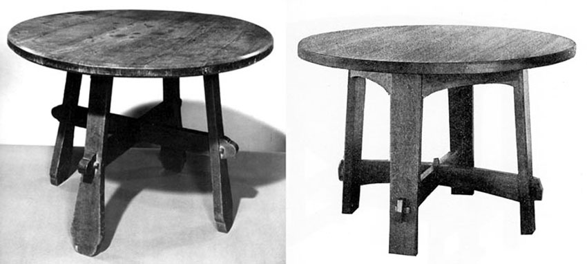 What consumers did with Craftsman products once they got them home and how owners of Craftsman houses furnished them is a subject worthy of an exhibition although it probably couldn’t get into an art museum. I have seen many pieces of Craftsman furniture “improved” with pyrography or other amateur handiwork. One lady I visited had a monumentally simple trestle table that her late husband had made cozy by carving a swirling paisley pattern into the top. She also had an early Craftsman sideboard with brass hardware that I’d never seen before and haven’t seen since. She cherished the furniture for what she thought it was supposed to mean, but she saw no philosophical dichotomy in regularly polishing the battleaxe-shaped escutcheons to a brilliant golden shine. Thirty-five years ago I was horrified; now I would say, “You go, girl!” Another lady living in a modest colonial-style house on Long Island got the whole Arts and Crafts simplicity shtick exactly as Ellis dictated. All the woodwork was unpainted and unvarnished. She had made portieres from nineteenth-century hand-woven blue and white coverlets recommended, not by The Craftsman, but by more widely read House Beautiful as representing the simple life enjoyed by colonial householders. Simple, quartered-oak Stickley furnished the dining room. Here’s the kicker: The Stickley was late, poorly made Hepplewhite-style furniture with veneer and string inlay and no apparent structural integrity. Nobody today wants to acknowledge that this stuff even existed let alone that it is just as “convenient, harmonious, and related in all its parts” as the furniture in the model dining room. Tucker is like the little old Long Island lady in that he sees what he expects to see. In the case of the “Chalet Table” (catalogue number 12), he sees a “radically simple” table that “eschewed constructive decoration to create a geometrically precise object that appears to suggest a prescient modernity.” The modernity suggested to me is that the table would be more logical were it made of molded plastic or welded steel because the lack of “constructive decoration” makes it look like it shouldn’t stand up at all. After pages and pages of extolling Stickley’s (perhaps more accurately Will Price’s) structural idea, Tucker chases his tail rationalizing the ways this dramatic table doesn’t measure up to Arts and Crafts standards. He guesses that the name “chalet” might have been chosen because “The architecture [of Swiss cottages] does not conceal the materials and methods of construction used.” While recognizing the table has none of a chalet’s structural integrity, he asserts that the table “presages” Stickley’s articulation of his approach to structure and function, so “the design shall represent, and not confuse the structural idea; in a word, that our art shall not conceal our article [italics in the original].” Even with the original italics, I’m confused about what this article is supposed to represent [italics mine]. |