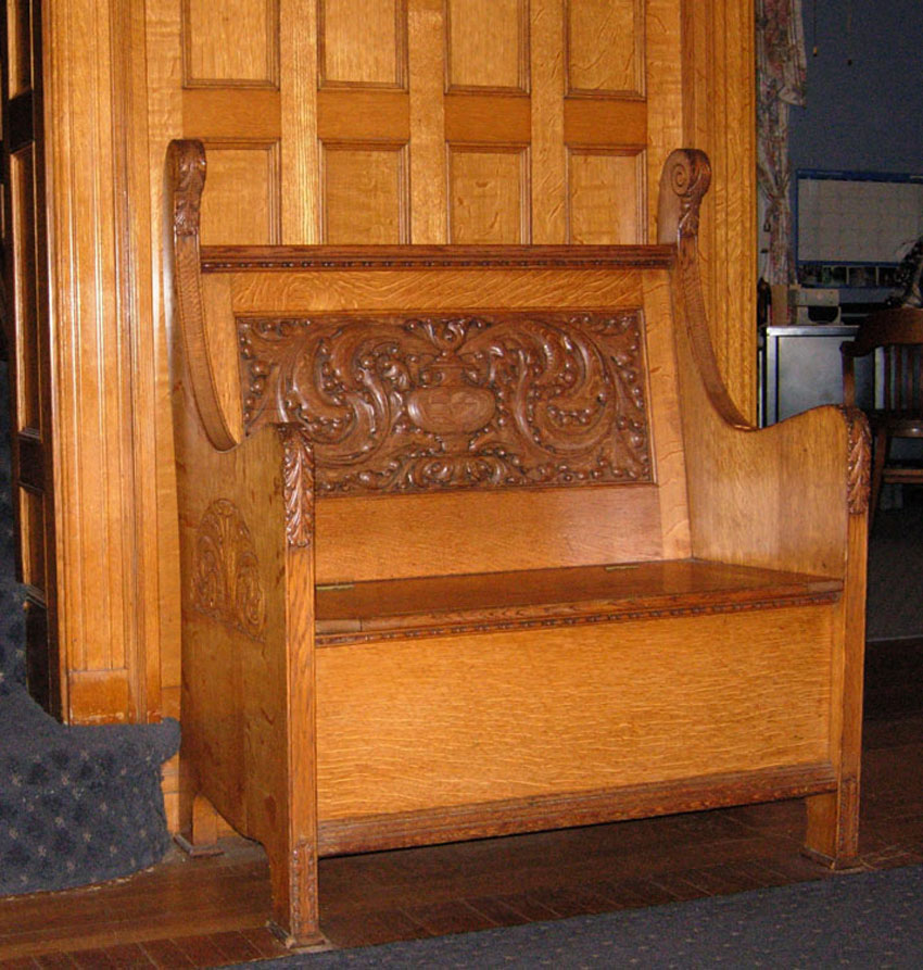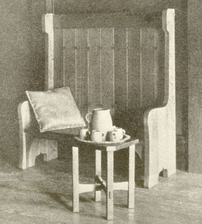 The Dallas show emphasis on unique or rare Craftsman designs validates the hundreds of thousands of dollars museums and collectors spent on Craftsman furniture. It may also explain why these designs have ended up on pedestals in art museums, but it does not explain Stickley’s place in America during the years between 1900 and 1913. Although it does not show on the floor plans of Stickley’s Syracuse home as drawn for The Craftsman, this bench was used in the foyer. Grandson Peter Wiles pointed out scratches that were visible in 1979 and claimed that they were made when he put his ice skates up on the seat to tie their laces. A similar, much longer settle used in the Syracuse dining room alcove proved unstable when subjected to modern central heating—the butterfly joints would shoot across the room like bullets when the back boards contracted. Of course these are also unique pieces, but the story of their use and abuse contributes to a cultural context. Provenance contributes more context: We used to find settles and chairs like the ones used in the 1972 Princeton exhibit in New England American Legion halls, in hotels like the old Poland Springs House, or on the porches of rural farms, but we seldom found “Ellis” inlaid furniture in such places.