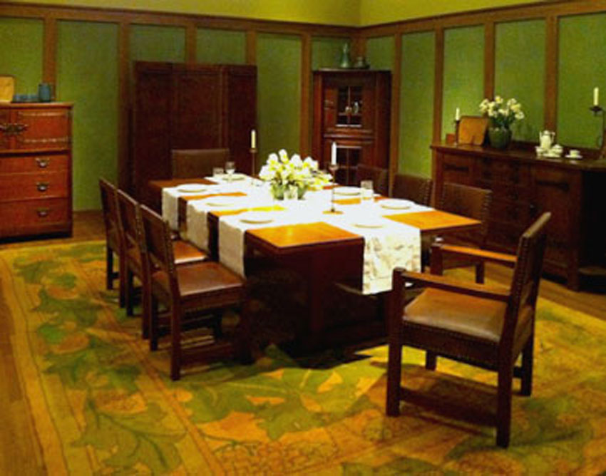 At Newark a seductive “re-creation” of the model dining room Stickley assembled for a 1903 Syracuse Arts and Crafts exhibition looms like a temple inside the entrance. There is an assumption of accuracy inherent in the idea of such a re-creation so, as my eyes adjusted to the dim light and I kneeled before the display in order to read the low-placed labels, I didn’t notice how much truthiness influenced my first impression. The spacious dimensions of the “room,” the rich colors, the marvelous furnishings, and the pretty yellow tulips made me forget that the installation was a propaganda tool for Stickley and Tucker that is many times removed from the way real people lived with Arts and Crafts furnishings at the turn of the last century. Few, if any, middle-class people had bungalows (Craftsman or otherwise) with dining rooms as grand as the model room. Fewer still furnished their homes with Craftsman furnishings only, and no one had these unique custom-made objects or out-of-season flowers arranged in tight–twenty-first-century bunches. The table used in the re-creation is not the table used in the original model room. To my way of thinking, this is significant because, even if the designs of both tables copy British precedent, the one used at Newark looks much more “innovative” and “progressive.” The oddest thing about the model room is Tucker’s contention that it “not only served to recognize Stickley’s success as a maker of furniture, but also reinforced his status as a central figure in the dissemination to the American public of Arts and Crafts design and its accompanying ideology celebrating labor, nature, and simplicity.” Stickley and his team created the room. Can Stickley award himself with success and status with the American public and the whole Arts and Crafts movement?