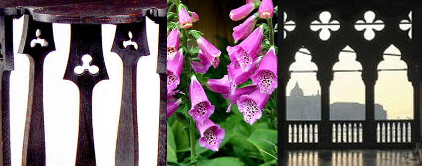 The eye of the beholder seldom sees incontrovertible truth. Sally-Anne Huxtable sees the legs of the “Foxglove Tabouret” as having “the long thimble shape of the flower’s profile.” When I compare a real foxglove flower to the table leg, I see no such similar profiles. Tucker sees these tables as less florid than “the more lavishly carved and inlaid Art Nouveau work of Nancy’s leading furniture makers Émile Gallé and Louis Majorelle,” again using the “the” to inaccurately color all French Art Nouveau. I think too much is being made of these tables; if they weren’t Stickley, they would be ignored as flimsy, hackneyed designs suitable only for the late-Victorian hodgepodge. David Cathers attempts to straighten out the sinuous lines of an amateur’s decorations on a tabouret by writing away what my eye sees: “The repeated floral pattern of each panel is symmetrical, with stiff conventionalized poppies, spade-shaped buds, and stems contrasting with the textured, hand-carved ground.” I see nondescript flowers set upon snake-like stems that further animate the already writhing background carved into the wavy wood grain, which appears to have been emphasized by a treatment John Scott Bradstreet called “jin-di-sugi.” The lively result is such a successful enhancement that the same model without Art Nouveau pyrographic embellishments should have been selected for an exhibition about Stickley products—the amateur issue is way beyond the scope of this project.