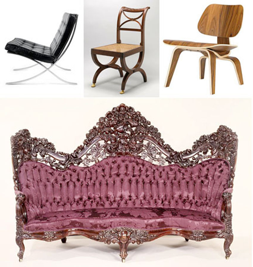 A premium was not placed on originality and innovation until the end of the twentieth century when a market for what is now called “mid-century modern” began to kindle. Once the Eames LCW chair was turned into a hot icon, earlier use of laminated wood was looked at from a different perspective. Belter’s crawling carved encrustations that had previously defined despised Victorian excess became “innovative” and even “progressive” because he layered thin sheets of rosewood to strengthen the otherwise brittle wood, which allowed him to achieve sweeping curves and extremely intricate decoration. It became more important to decide who was first rather than to discuss what was pleasing. Gustav Stickley’s clumsy table number 935 was more desirable (i.e., valuable) than L. and J. G. Stickley’s more refined “director’s table” because Gustav copied Baillie Scott first. Craftsman’s 1902 hulking, user-unfriendly number 210 settle was more desirable than Stickley Brothers’ later, gentler settle number 3863.