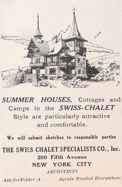 The advertisement for chalet-style houses appears on the back of a 1913 Arts and Decoration page with an advertisement for Craftsman Furniture featuring a portrait of Gustav Stickley—not what you’d expect of “architecture [that] does not conceal the materials and methods of construction used,” which relates to the “prescient modernity” of Stickley’s “geometrically precise,” “radically simple” chalet table. |
