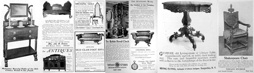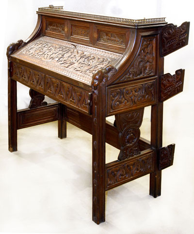 Rohlfs claimed he began to make furniture because he and Anna needed to furnish their home; they couldn’t afford the “Colonial” antiques they admired and didn’t admire available mass-produced furnishings. The only place in the book that suggests Colonial Revival influences is the reproduced catalogue where one finds names like “Martha Washington,” “Ben Franklin,” or “Alexander Hamilton” for candlesticks, which seem to have nothing “Colonial” about their design. Rohlfs’s references to American history would be easier to understand if one were aware of family photographs now in the Winterthur Library. Tellingly these research materials were given by ADA 1900 with a restriction prohibiting public access until a year after their book was published. Among the many professional photographs is one of a large sideboard made by Rohlfs in what we now call American Classical style. For most of the 20th century such a sideboard would have been categorized as “Empire,” but when Rohlfs made his mahogany version, furniture like this was marketed as “Colonial” even though the furniture it imitated was made in the 1830s. The Rohlfs sideboard is monumentally simple and reminiscent of “Mission” sideboards, but much “Empire” furniture has the exaggerated proportions and decorations that distinguish Rohlfs designs. The “Louis Quatorze Sofa” was actually no more than fifty years old when Rohlfs began to make furniture. Tiffany claims that his “Shakespeare Chair” is an “early eighteenth century design, made up from the carved pew ends lately removed from Holy Trinity Church, at Stratford-on-Avon, where lie the remains of William Shakespeare.” Whatever one may think of these travesties, Rohlfs may have thought their “virtuosic carving and imaginative silhouettes” inspiring. The doctor seldom mentions restorations on objects owned by ADA 1900, but he goes to extraordinary lengths to document restorations on pieces belonging to others in an attempt to diminish their significance. He has the gall to denounce the desk now at the Virginia Museum of Art as a copy, but never mentions that precious little is original on ADA 1900’s “Candelabrum,” which he considers to be a unique masterpiece. He smears his most “defecatory” invective on the “Desk with Overhead Gallery” in a bald-faced effort to aggrandize ADA’s more pedestrian “Desk with Suspended Gallery.” He proclaims that the structural problems with “Desk with Overhead Gallery” required that the overhead gallery be remounted in such a way that the chains no longer carry weight. As I see it, his argument carries no weight; the dramatic visual effect is not diminished and “Desk with Overhead Gallery” still outshines ADA 1900’s “Desk with Suspended Gallery.” “Desk with Overhead Gallery” has long been associated with “Carved Swivel Chair,” but the doctor has decided that they should not be paired because the chair does not fit in the kneehole of the desk. He thinks the chair was more likely to have been paired with “Library Table” from the same commission, which he dates to 1898 or 1899 because drawings of it survive on the back of a manuscript page from a novel Anna Rohlfs was working on at the time. There is absolutely no reason that the drawings should date to the same time as the writing of the novel or that the drawing was done as a preliminary sketch as the doctor supposes when he marvels “when Rohlfs put pencil to paper, he had a rather clear concept of formal [whatever that means], structural, and decorative details. …Though sketchy in quality and lacking in detail, [the drawings] give a remarkably full sense of the Library Table as it was completed…” I can come up with another credible if imaginary scenario where Rohlfs is entertaining a prospective client at home among his many pieces of “inventory,” none of which exactly suits the client’s needs; Rohlfs grabs the nearest scrap of paper and makes a quick sketch of the completed “Library Table” to show the client other options. There is no reason to expect a prize committee to know that there are a good many more green Rohlfs pieces around than the “Desk with Overhead Gallery,” the “Carved Swivel Chair,” and the “Library Table” that the doctor guesses “may be the only extant examples of Rohlfs furniture with green exterior finish.” Nor would committees know that few library tables of the period could be used with a chair. As any Arts and Crafts collector knows, the apron or drawer on a library table is usually too low to allow an armchair to be drawn close enough to work at the table and if it isn’t, the stretcher under most library tables crunches a sitter’s shins.