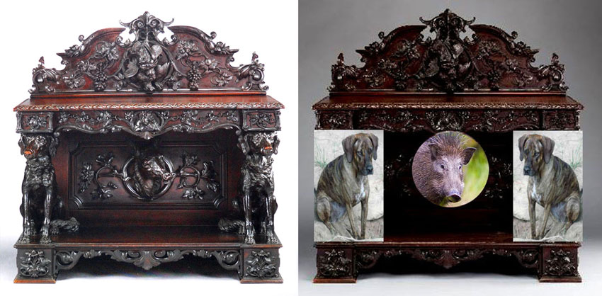 Examples of misinterpretation in Carnegie’s new decorative arts “handbook” are varied. Some compromise the established history of an object: “Dawson Dawson-Watson, who designed the form and decoration of the settle, was no doubt influenced by the presence at Byrdcliffe of such talented artists as Wilhelm Hunt Diederich and Arthur Wesley Dow.” Dawson-Watson designed the Tirol settle long before Diederich came to stay with the Whiteheads at White Pines in the late 1920s after the furniture-making enterprise had ceased. Dow was never physically present at Byrdcliffe although he was an influence on Zulma Steele and Edna Walker. Other interpretations miss an opportunity to interest young visitors. A deer head is said to ornament a sideboard attributed to Alexander Roux. The prominent dogs sitting on either side of the head (at a nose-to-nose, eye-to-eye level for a child) are not mentioned. How exciting it would be for kids to know the real story or for adults to understand the 19th century dining room’s bloodthirsty material culture. The head is actually a wild hog’s and the dogs are boarhounds! |