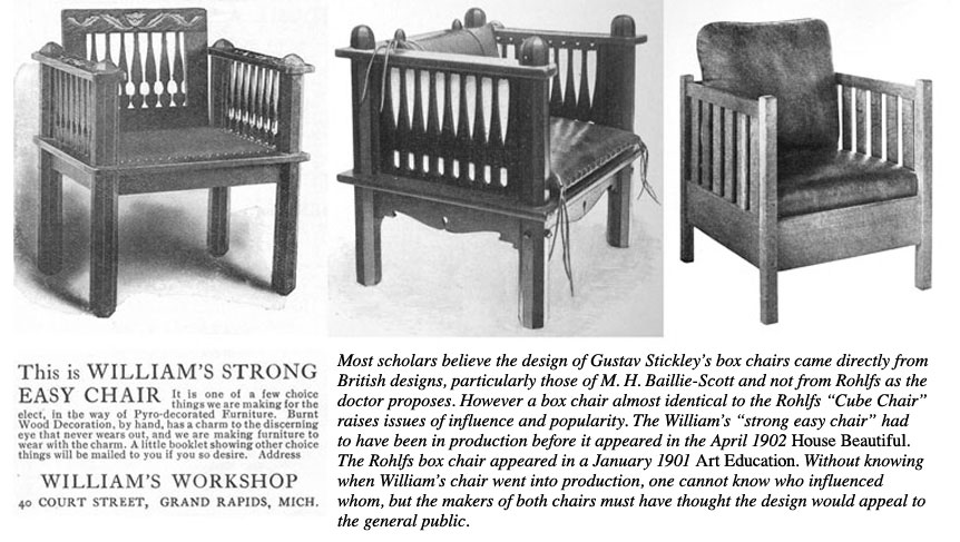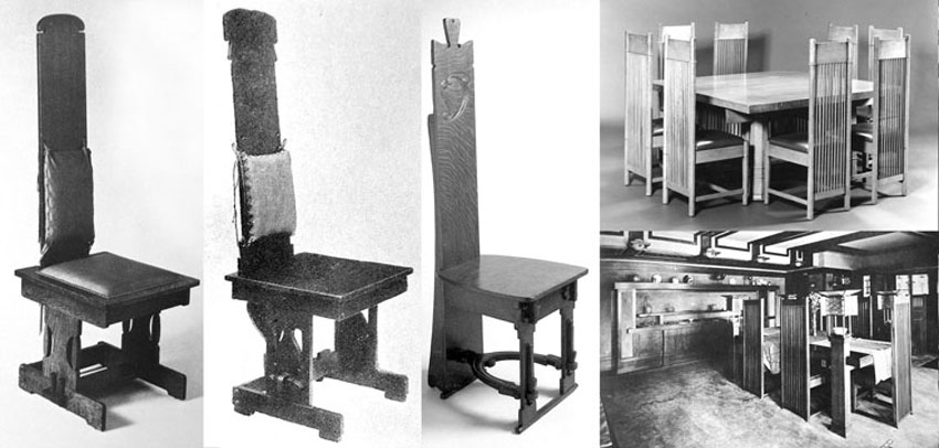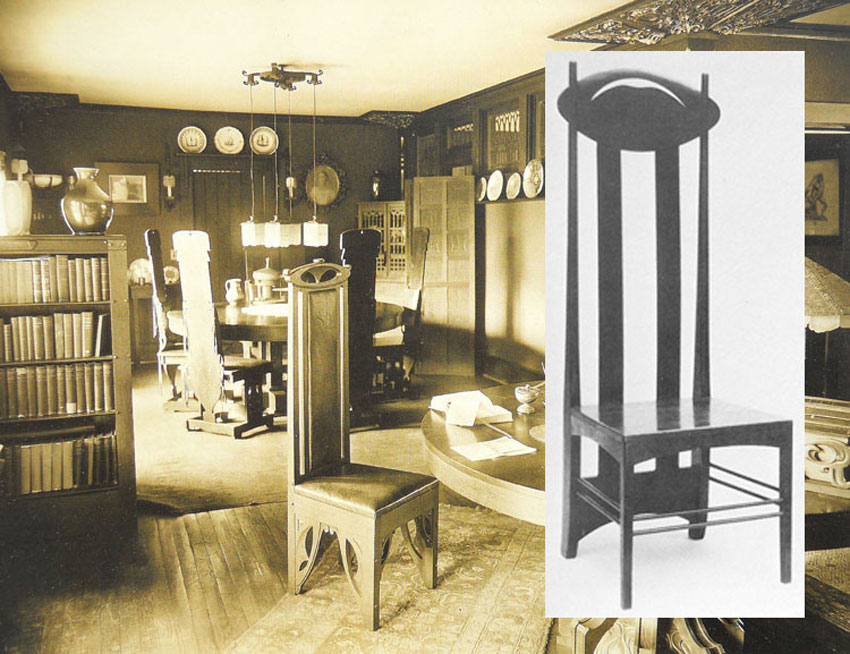 The doctor goes on about how the Rohlfs high-backed chairs were influenced by or influenced Frank Lloyd Wright’s and the other Prairie School architects’ designs. He also argues that Rohlfs furniture was popular in its day. The Wright connection is supported by the fact that the Martin House was in Buffalo where Rohlfs lived and worked. Rohlfs’s popularity is gauged by what hack writers of the day wrote in shelter-magazine fluff. An opportunity to support both theories was missed by giving short shrift to Rohlfs’s many and varied high-backed dining chair designs. Dinning chairs and tables were produced at the Rohlfs shop in numbers greater than any other Rohlfs design. A comprehensive list would probably show that they formed the bulk of his production and sales. Grouped around a table, his tall-backed chairs form a room within a room just like Wright’s designs for the Barton dining suite (part of the Martin complex in Buffalo) or his more famous Robie dining suite. |