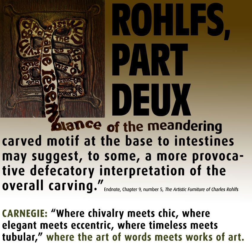 In many cases overwrought descriptions are passed off as “analysis.” I have the space and patience to cite only a few here, but a reader in search of something amusing to while away a dreary day will find many more seats at this Mad Hatter’s tea party. “The deep level of object analysis which is a hallmark of our work” amounts to page after page of theorizing based on faulty premises and laced with such specific, analytical terms as “sublime,” “remarkable,” “stunning,” “profoundly rare,” “fully uncarved,” or “carved entirely from single boards.” The doctor sees nightmarish body parts everywhere in Rohlfs carving, when it’s not mini gonads up against monstrous vajayjays, it’s pelvises riddled with cavities and spines spiked with jutting bean-shaped lobes. Cunningham’s perceptive, provocative observation that the carving on the back of Desk Chair was inspired by the cellular structure of oak is disappointingly supported only by the fact that Rohlfs owned a microscope. The reader is expected to credit Cunningham’s authority on points that should be accompanied by adequate endnotes with pertinent citations. He repeatedly makes assumptions about Rohlfs furniture based on his notion that there is only one example of this or that piece extant when he would be wiser to leave room for new discoveries by writing, “only one example of this design is known to exist.” He, himself, discovered a previously unknown chair while writing his book. He does not know of another example of the design so he asserts that the single chair he found proves that a commission to make multiples for a Cornell fraternity was never carried out because his chair has a grain pattern matching the pattern on a chair in a period photograph. The story of the H. H. Richardson-designed chairs that were rescued from a dumpster as they were being tossed from the windows of the building they were meant to furnish should be remembered. I’m not saying Cunningham’s conjecture is inaccurate; I’m saying it proves nothing and is no more than a possibility.