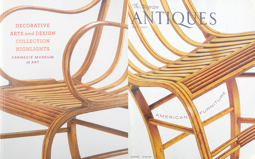 Were it not for vagaries of fashion in collecting and gallery installation Charles Rohlfs and Samuel Gragg would never have made it into the hallowed halls of art museums. After the curvy lines of a Gragg chair were used for the cover of The Magazine Antiques, the Hirschl & Adler Gallery featured an example with arms in one of their lavish displays at a major antiques show. Now that armchair is featured in Carnegie’s Bruce Galleries and on the cover of their handbook, which is strikingly similar to the Antiques cover.