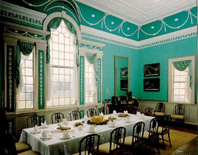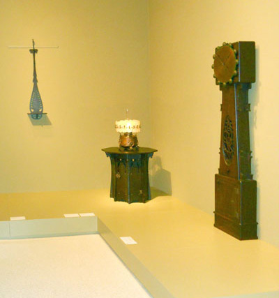 The Artistic Furniture of Charles Rohlfs is too cumbersome to be a handbook and too rambling to be a catalogue, so one needs a great deal of prior knowledge about Rohlfs to begin to understand the Rohlfs exhibition, which has been installed with much good taste. The curators even found the “gray” paint researched for their Bruce gallery installation of the early nineteenth-century Pic Nic suite to be close enough to an Arts and Crafts green to serve as a background for late nineteenth-century Rohlfs—what goes around, comes around. Back in the 1970s there was much excitement about research “proving” the subtle, tasteful colors used during the 1950s to reconstruct Colonial Williamsburg and Henry Francis DuPont’s Winterthur period rooms should have been raucously bright. Everyone scrambled to repaint and we got a cheery (if hard to take) carousel of colors at places like the Harrison Gray Otis house and Mount Vernon. I guess the current fashion in research has proven that those old Williamsburg colors were okay after all, but I wonder if anyone has bothered to analyze the greens favored during the 1890s--1910s Arts & Crafts movement. The green glaze found on Grueby pottery is often used as the standard, but that color taken out of context and viewed as an isolated swatch is actually quite vivid—the blue/green color of Teco’s most famous matte glaze is almost garish. When drab green embroidery threads layered on linen table covers are separated, they reveal threads of vivid colors never exposed to sunlight. Green wallpapers faded almost immediately and the wood under transparent green stains darkened the apparent color of the wood over time. Green-stained Rohlfs furniture exists, but no example was evident at Carnegie. | |