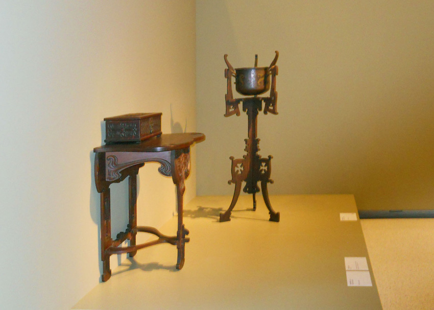 In my earlier discussion comparing the Stephen Gray Stickley book and exhibition to the Doctors Barnes and Cunningham Rohlfs book and exhibition, I promised to expand upon my observations about the doctors’ version of Rohlfs after I saw their exhibition. A neater segue than the installation at the Carnegie Museum of Art could not be found. Carnegie’s Alan G. and Jane A. Lehman Curator of Decorative Arts Jason Busch was assistant curator of American decorative arts at the Wadsworth Atheneum Museum of Art in Hartford, Connecticut, which hosted the Gray Stickley show so reviled by the doctors. For now, paintings and sculpture are taking a back seat at the Carnegie Museum, where the Rohlfs show was paired with a “complementary” tapestry show in the temporary exhibit galleries and a new installation of decorative arts called “The Art of Daily Life” is in the Ailsa Mellon Bruce Galleries.