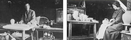 Jane Whitehead began ceramics lessons at the Byrdcliffe Pottery during the summer of 1913, and by 1915 the Whiteheads were already outfitting their own pottery. Despite the wealth of material evidence and surviving correspondence between members of the family, the reasons for their establishing a pottery separate from the Byrdcliffe enterprise are not clear. However, coming long after Byrdcliffe had become more of a Whitehead family compound than an Arts and Crafts colony, the act would probably not have been seen by the Whiteheads as competition with “the Pottery Ladies,” who ran the Byrdcliffe Pottery until 1923, with the help from time to time of Mabel Davison. According to a note in Jane Byrd Whitehead’s calendar, Zulma Steele took it over that year, operating it until at least 1928. The relationship between the White Pines and Byrdcliffe Potteries was never explicitly stated. The Whiteheads labeled their pottery “White Pines,” but Ralph gave his working address as the Byrdcliffe Pottery, according to the records of the American Ceramics Society, which he joined in 1917. Nevertheless, their products are easily distinguishable. White Pines pottery was slip-cast for the most part, although some pieces were wheel-thrown, and a few were hand built. Byrdcliffe pots were always hand built. The contemporary press said of them: “Misses Penman and Hardenburgh showed a number of their hand built pieces, which are ever interesting and show much appreciation of fine color, textures and form”; and, “The Misses Penman and Hardenberg [sic], whom many of us have watched as they built up one interesting shape after another at their pottery at Byrdcliffe in the Catskill mountains, exhibited a water jug and several bowls with colorful underglaze decorations.” Byrdcliffe ceramics were marked with a pair of stylized wings, impressed, and sometimes with “Byrdcliffe” and/or “Penman” and “Hardenburgh” also impressed. White Pines pottery displays a variety of marks. One is an arrow and a single wing wither incised or applied with glaze. Sometimes the initials RRW, standing for Ralph Radcliffe-Whitehead, are included with the wing and arrow device. Incised capital letters designate the clay body used, and painted numbers further identify the pots, which in some instances can be coordinated with Whitehead’s pottery record books and sales book. Also a black and white paper label, comprising a circle with a stylized pine tree, remains on some of the pots. In addition, some pots have paper price labels or price labels or prices marked on the bottom. Through evidence compiled from correspondence, Whitehead’s record books, and plans, photographs, and drawings remaining at White Pines, there unfolds a fascinating account of the couple’s working methods, the division of labor between them, their goals, both aesthetic and commercial, and the not inconsiderable role that pottery making played in their emotional lives. Jane’s first lessons were undoubtedly from Penman and Hardenburgh, but upon her return to California in the fall of 1913, she turned for instruction to the internationally respected ceramist and teacher Frederick Hurten Rhead, who had established a pottery studio and school in Santa Barbara that year. Jane’s calendar entries record that she met with the Rheads the day after her arrival in California, and five days later she noted: “Carried to Pottery all biscuits.” She must have transported her biscuit-fired pots from Woodstock to Santa Barbara, seeking specific help with glazes. Documents reveal business and social relationships between the Whiteheads and the Rheads as well, the Rheads having come to Christmas dinner in 1913, and in early January Jane noted, “R[alph] takes share in Pottery.” The following summer Jane worked again with Penman and Hardenburgh, and during August she attended ceramics classes at the University of Chicago. A calendar entry, “Whitford,” on her first day of classes identifies her instructor as William G. Whitford, formerly of the Buffalo Pottery. After Jane’s return to Woodstock in late August, Ralph, whose interest in his wife’s work heretofore could have been considered merely supportive, began to take an interest in making pottery himself. Jane wrote: “He has been helping me daily in the pottery work, & I am very grateful. I really think it must interest him a bit.” Her speculation proved correct, for in January 1915 Ralph began to keep detailed records of his own work, and he wrote to his son, “Mother and I have burnt the pottery today. I think we can find out some of the processes of pottery in the next two months. But you cannot learn much about a craft like pottery unless you work at it daily for a couple of years. Anything else is merely amateurish!” With his fear of amateurishness, Ralph pursued mastery of the craft for the next decade. The last of his pottery record books was dated 1926. |